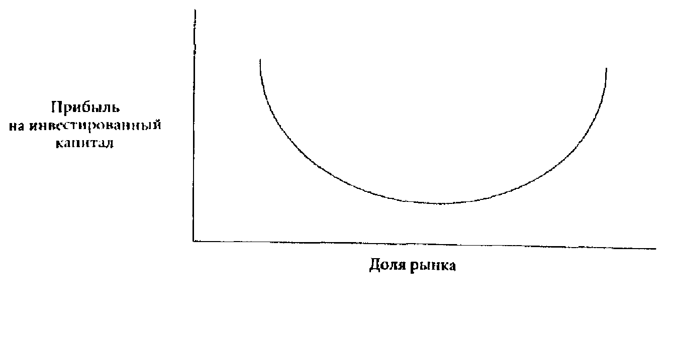 Из рассматриваемых положений вытекают некоторые выводы о возможных взаимосвязях между долей рынка и прибыльностью. В ряде отраслей проблема зависания на середине выражается в том, что самыми прибыльными являются более мелкие фирмы (обладающие способностью к фокусированию или дифференциации) и крупнейшие фирмы (лидеры по издержкам), тогда как фирмы среднего масштаба наименее прибыльны. Иначе говоря, соотношение между прибыльностью и долей рынка выражается U-образной кривой (см. рис. 2,2). Примером такого соотношения может служить отрасль по производству маломощных электродвигателей в США. В этом производстве фирмы General Electric и Emerson обладает большей долей рынка и сильными позициями по издержкам, кроме того, General Electric имеет репутацию обладателя наиболее передовых технологий. Считается, что в обеих фирмах производство моторов приносит высокую прибыль. Фирмы Baldor и Gould проводят стратегию фокусирования: Baldor сосредоточена на каналах распределения и сбыта, a Gould ориентируется на определенные сегменты потребительского рынка. Обе фирмы также считаются прибыльными. Фирма Franklin занимает промежуточную позицию, стратегия которой не является ни низкозатратной, ни сфокусированной, что отражается и на ее финансовых результатах. Подобное U-образное соотношение, по всей видимости, также характеризует в общих чертах ситуацию в мировой автомобильной промышленности, где лидерами по прибыли являются такие фирмы, как General Motors (позиция низких издержек) и Mercedes (дифференциация). Chrysler, British Leyland и Fiat не располагают позициями ни в издержках, ни в дифференциации, ни в сфокусированности — они застряли на середине*.