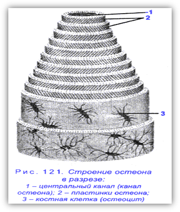 Остеон состоит из костных пластинок, концентрически расположенных вокруг центрального канала – ГАВЕРСОВ КАНАЛ, в котором залегают кровеносные сосуды и нервы. Соседние остеоны соединены между собой с помощью ВСТАВОЧНЫХ ПЛАСТИН. Гаверсовы каналы соседних остеонов сообщаются между собой с помощью ФОЛЬКМАНОВСКИХ КАНАЛОВ, которые сообщаются с кровеносными сосудами надкостницы, образуя единую систему – ГАВЕРСОВА СИСТЕМА.