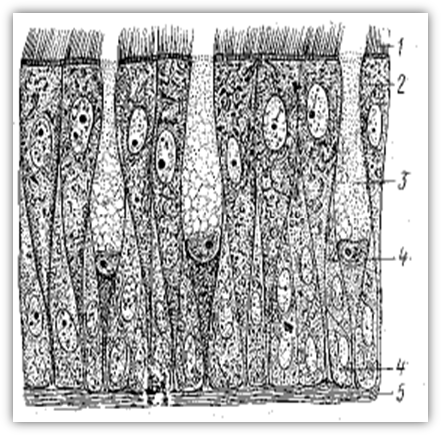 Рис. « Однослойный многорядный призматический мерцательный эпителий слизистой оболочки носа»: 1 – мерцательные клетки; 2 –3 – бокаловидные клетки; 4 – замещающие клетки; 5 – базальная мембрана