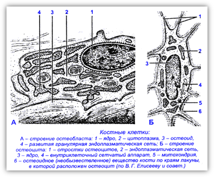Костные клетки (остеоциты) имеют отростчатую форму и лежат в небольших костных полостях, которые повторяют их форму. Остеоциты – это зрелые клетки, неспособные к делению. В них имеется ядро овальной формы и полный набор органелл. Наряду с остеоцитами в костной ткани есть ещё остеобласты – молодые клетки, участвующие в образовании новой костной ткани, и остеокласты – специальные клетки, разрушающие костную ткань.