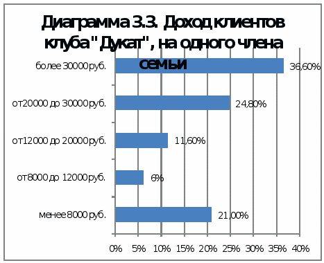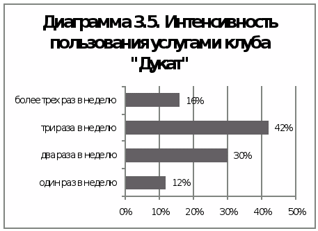 Имея возможности обслуживать в месяц до 800 человек, фитнес клуб «Дукат» в данное время принимает в своих стенах всего 400. В общем сравнении результат неплохой, опять стабильная средняя позиции. После проведения всех исследований микросреды фитнес клуба «Дукат», мы составим план развития, который будут способствовать увеличению спроса на услуги клуба.