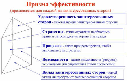 Возникает следующий вопрос, - какими же аспектами взаимоотношений с заинтересованными сторонами следует управлять? Для ответа на него предлагается применить "призму эффективности".