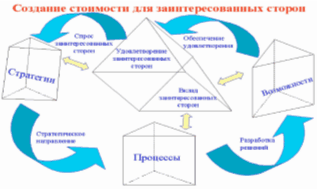 На рис.2 приведена структура таких отношений. Отметим, что этот список для конкретного предприятия может изменяться (сокращаться или дополняться). Главное, что этот подход гибок, позволяет оценивать и управлять действительными интересами любого предприятия. Отметим, что традиционная версия BSC учитывает интересы и взаимосвязь только с акционерами, хозяевами, клиентами, поставщиками и частично с наемными работниками, причем по ограниченному набору аспектов.