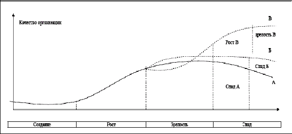 На рисунке часть кривой, имеющая положительный наклон, отражает стадии создания, роста и зрелости организации, другая ее часть с отрицательным наклоном - стадия упадка организации (спад).