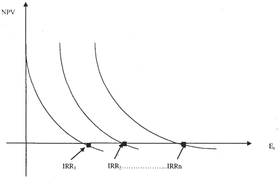 Экономический смысл показателя внутренней нормы рентабельности проекта состоит в том, что с его помощью определяется темп роста капитала, инвестированного в проект. Величину IRR можно определить с помощью графического метода (Приложение 1). Для этого строится график значений NPV пpи различных значениях ставки дисконта. При этом значение Ес, при котором график пересекает ось абсцисс и определяет искомое значение IRR (IRR1 IRR2 …IRRn).