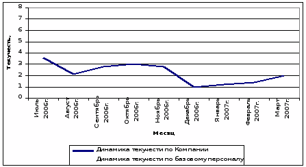 Проведенный анализ эффективности нововведения показал привлекательность проекта: снижение потока претендентов на базовую специальность до 35% позволит увеличить время проведения собеседования с кандидатом на 10 минут, что приведет к улучшению качества отбора основного персонала. Так же снижение текучести базового персонала на 4% позволят сократить издержки на процесс привлечения на 5%. При среднемесячной рентабельности проекта в 16,7% за период проекта с мая 2007г. по январь 2007г. срок окупаемости проекта составит 8,5 месяцев, что менее срока самого проекта на 0,5 месяца. При этом, при ставке дисконтирования = 15% IRR составит 33%, что в свою очередь говорит о том, что компания будет незначительно рисковать при проведении нововведения.