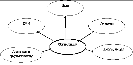 Непосредственную целенаправленную вербовку – налаживание организацией контактов, с теми, кто представляет для нее интерес в качестве потенциальных сотрудников с целью побудить интерес и подать заявление о работе. Она производится:
