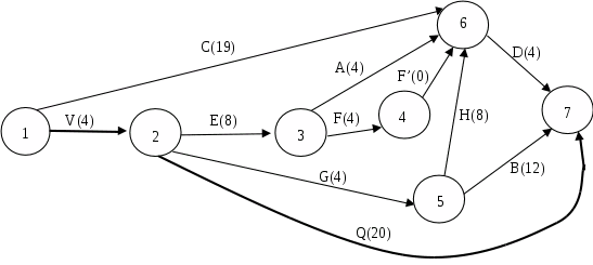 Просматривая все полные некритические пути, убеждаемся, что при сокращении срока строительства на 4 месяца, т.е. до 20 месяцев, критическими могут стать пути Р1 и Р6 . Длина первого 23 месяца, а длина второго равна 24 месяца. Эти пути не содержат общих работ. Для первого пути эффективно сократить работу С на 3 месяца, а для шестого – Q на 4 месяца. При этом дополнительные затраты составят: