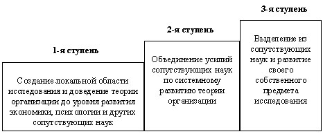 Развитие теории организации включает три конкретных этапа, которые в свою очередь могут быть поделены на соответствующие подэтапы:
