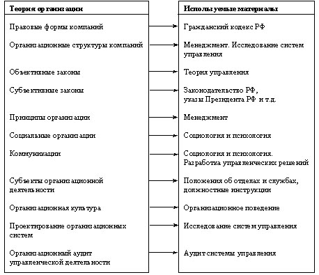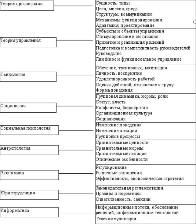 Организацией как объектом исследования занимаются менеджмент, экономика, социология, психология, политология и другие науки. Каждая из этих дисциплин рассматривает лишь часть процессов, происходящих в организации. Так, менеджмент рассматривает вопросы, связанные с элементами организации и процесса управления, коммуникациями, с организацией взаимодействия и полномочий, построения организаций. Экономика изучает элементы организации и оплаты труда; организации производства; экономические законы развития, в том числе пропорционального и планомерного развития, соответствия производственных отношений характеру производительных сил. Психология изучает психическое отражение человеком различных аспектов организационных отношений. Политология рассматривает отношение людей к политическим организациям, проблемам внутренней и внешней политики. Однако это лишь элементы, составляющие организацию в целом как процесс и как явление. Предпринимались попытки объединить усилия перечисленных наук в области исследования организаций как больших систем посредством кибернетики, теории управления. Так, теория управления изучает следующие проблемы, касающиеся организации: производство как система, типы отношений управления, организационная структура управления, линейные и функциональные связи, организационно-распорядительные методы управления, организация процесса управления, организация управленческого труда. Дальнейшее развитие исследований в области теории управления способствовало выделению теории организации как самостоятельной новой науки. Она призвана интегрированно подходить к ключевым процессам, происходящим в формальных и неформальных объединениях людей и их коммуникациях.