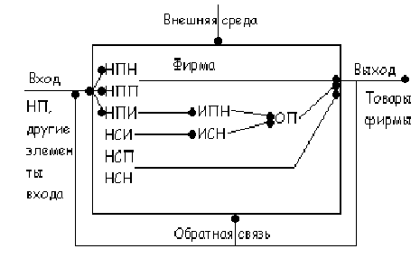 НП – новшества покупные, НПН – новшества покупные для накопления, НПП – то же на продажу, НПИ – то же в инновации, НСИ – новшества собственного производства (разработки), реализуемые в инновациях, НСП – то же на продажу, НСН – то же для накопления, ИПН – инновации покупных новшеств, ИСН – инновации собственных новшеств, ОП – основная продукция фирмы.