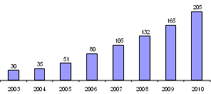 На рисунке 2.3. подробно динамика выручки компании «Техносила», от реализации продукции в период с 2003 по 2008 год (в млрд. долларов).