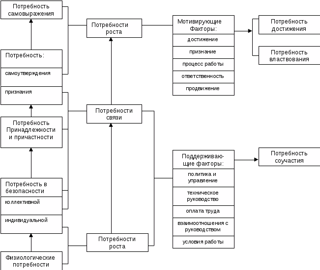 Потребности существования как бы включают в себя две группы потребностей пирамиды А. Маслоу: физиологические потребности и потребности безопасности за исключением групповой безопасности. Группа потребностей связи наглядно корреспондирует с группой потребностей принадлежности и причастности. Потребность связи по К. Альдерферу отражает социальную природу человека, стремление человека быть членом семьи, иметь коллег, друзей, врагов, начальников и подчиненных. Поэтому в данной группе можно отнести также часть потребностей признания и самоутверждения из пирамиды А. Маслоу, которые связаны со стремлением человека занимать определенное положение в окружающем мире, а также ту часть потребностей безопасности пирамиды А. Маслоу, которые связаны с групповой безопасностью. Потребности роста аналогичны потребностям самовыражения пирамиды А. Маслоу и включают в себя также те потребности группы признания и самоутверждения, которые связаны со стремлением к развитию уверенности, стремлением к самосовершенствованию и т.п. Эти три группы потребностей, также как и в теории А. Маслоу, расположены иерархически. Однако между теориями А. Маслоу и К. Альдерфера есть одно принципиальное различие – по А. Маслоу движение происходит от потребности к потребности только снизу вверх, а К. Альдерфер считает, что движение идет в обе стороны: наверх, если удовлетворена потребность нижнего уровня, и вниз, если не удовлетворяется потребность более высокого уровня. При этом, по мнению К. Альдерфера, в случае неудовлетворенности потребности верхнего уровня, усиливается степень действия потребности более низкого уровня, и переключает внимание человека на этот уровень. Например, если человек никак не смог удовлетворить потребности роста, у него «включаются» потребности связи, и это вызывает процесс регрессии с верхнего уровня потребности на нижний. В соответствии с теорией К. Альдерфера иерархия потребностей отражает восхождение от более конкретных потребностей к менее конкретным, Он считает, что каждый раз, когда потребность не удовлетворяется, происходит переключение на более конкретную потребность, что определяет наличие обратного хода сверху вниз.