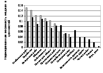 Шестым этапом в нашем исследовании будет подведение итоговой черты. После обработки полученных данных можно суверенностью сказать, что принципиальные различия в иерархии основных трудовых ценностей рабочих машиностроительных предприятий г. Краматорска и г. Славянска отсутствуют, так же являются в основном одинаковы с иерархией трудовых ценностей преподавателей. Важно, что значимость работы самой по себе и конкретная альтруистская ценность у станочников достаточно велика, однако как показывает исследование в заготовительных цехах завода её значение заметно пошатнулось. Если хороший заработок является высокозначимым для 92,5% – респондентов заготовительных цехов, так же для 63% – респондентов станочников, для 47% – преподавателей; то интересная работа – для 50,9% (см. табл. 2.3.2), 41% (см. табл. 2.3.6), а польза для коллектива, общества – для 45.3% (см. табл. 2.3.1), 39% (см. табл. 2.3.6). При этом респонденты относительно единодушны в своих оценках. Вместе с тем многие ценности, имеющие высокую значимость для респондентов, плохо реализуются. Такие, как «условия труда» и т.д. Так, обратим также внимание на ценности, получившие самые низкие оценки, хотя они, казалось бы, не важны для респондентов: «продвижение по должности», «участие в управлении».