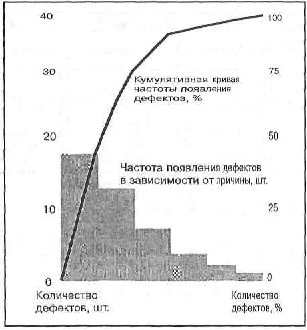 диаграммы Парето, которая представляет собой гистограмму появления различных причин несоответствий, упорядоченных по частоте. На рисунке 4 изображена условная диаграмма Парето.