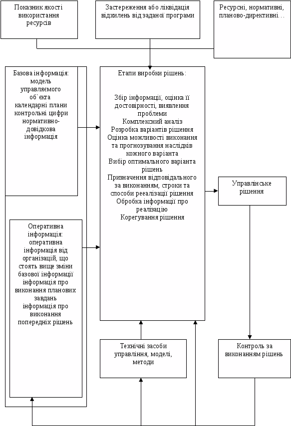 Процес прийняття рiшень в контурі управління виступає основним елементом, що здійснює, з одного боку, визначальний вплив на інші елементи процесу управління, пов'язані з реалізацією прийнятого рішення та з оцінкою отриманих результатів, а з іншого, - сам відчуває їхній вплив в результаті дії зворотнього зв`язку [6].