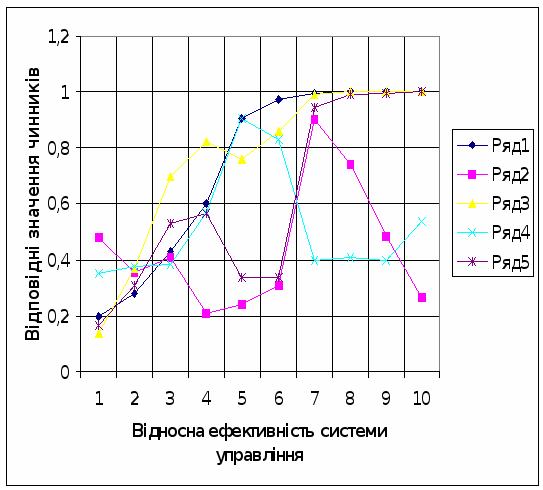 А отримана залежність відносної ефективності системи управління від чинників, що впливають на прийняття управлінських рішень, відображена на рисунку 3.