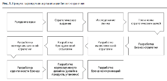Процесс зарождения и реализации бизнесстратегии средствами маркетинга, брендинга, дизайна и коммуникаций можно изобразить так, как показано на рис. 1, но это так называемый идеальный вариант.