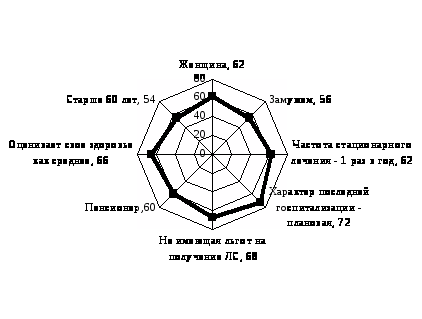 Таким образом, потребителем услуг КОКБМГ является замужняя женщина, в возрасте старше 60 лет, пенсионер, не имеющая льгот на получение лекарственных препаратов, оценивающая свое здоровье как среднее, проходившая лечение в стационарных условиях согласно плановой госпитализации один раз за год (рис. 19).