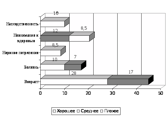 66% респондентов оценили свое здоровье как среднее, 22% как хорошее и 12% как плохое; 38% причиной такого состояния здоровья назвали возраст, по 15% объяснили его болезнью и нервным потрясением, 21% невниманием к своему здоровью и 11% наследственной предрасположенностью. При этом, соотношение причин и состояния здоровья представлены на рис.18.