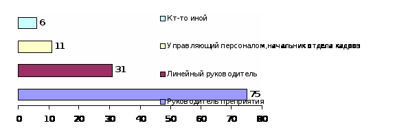 В 75 компаниях решение о найме принимает руководитель предприятия. Иногда он это право делегирует линейному руководителю (31 случай). Еще реже доверяют управляющим персоналом и начальникам отделов кадров (11 случаев). Встречаются случаи коллективного принятия решения по данному вопросу, либо данное право закреплено за учредителем. Но это обстоятельство скорее зависит от духа и буквы учредительных документов предприятия, чем от доверия или недоверия к тому же директору.