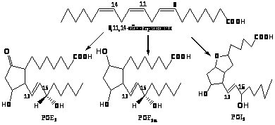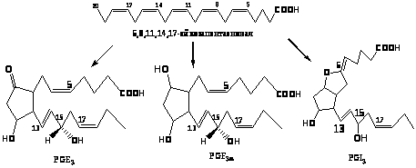 Третья группа эйкозаноидов происходит из тимнодоновой кислоты (С20: 5). Эйкозаноидам этой группы присваивается индекс 3. Например, PgE>3>, PgI>3>
