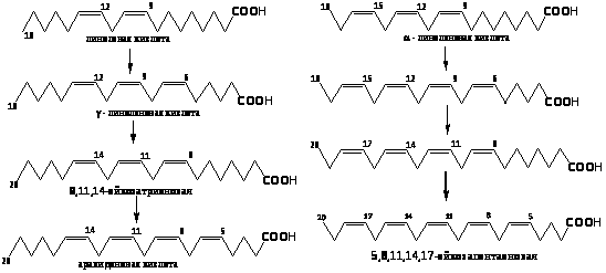 Рис.1. Синтез полиеновых жирных кислот с 20 углеродными атомами в организме человека.