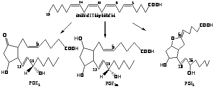 Фермент, катализирующий первый этап синтеза простагландинов, называется PG Н2 синтазой и имеет 2 каталитических центра. Один из них называют циклооксигеназой, другой - пероксидазой. Этот фермент представляет собой димер гликопротеинов, состоящий из идентичных полипептидных цепей. Фермент имеет гидрофобный домен, погружённый в липидный слой мембран ЭР, и каталитический домен, обращённый в полость ЭР. В активном центре циклооксигеназы находится тирозин (385), в активном центре пероксидазы - простетическая группа - гем. В организме имеются 2 типа циклооксигеназ (PGН>2> синтаз). Циклооксигеназа 1 - конститутивный фермент, синтезирующийся с постоянной скоростью. Синтез циклооксигеназы 2 увеличивается при воспалении и индуцируется соответствующими медиаторами - цитокинами. Оба типа циклооксигеназ катализируют включение 4 атомов кислорода в арахидоновую кислоту и формирование пятичленного кольца. В результате образуется нестабильное гидропероксидпроизводное, называемое PG G>2>. Гидропероксид у 15-го атома углерода быстро восстанавливается до гидроксильной группы пероксидазой с образованием PG Н>2>. До образования PG Н>2> путь синтеза разных типов простагландинов одинаков. Дальнейшие превращения PG Н>2> специфичны для каждого типа клеток.