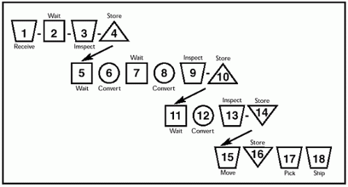 Для того, чтобы начать процесс обоснования величины ROI, необходимо определить, где происходят задержки в движении или где ресурсы расходуются на непроизводительные нужды. Такие места могут быть приняты во внимание в будущих системах, при реинжиниринге или при процедурной оптимизации. Рассмотрим рис. 10 для определения операций, не создающих добавленную стоимость.
