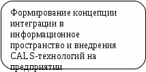 На основе проведенного анализа формируется концепция интеграции в информационное пространство посредством внедрения CALS-технологий на предприятии. Формирование концепции включает выбор показателей оценки эффективности процессов, формирование целей внедрения CALS-технологий и стратегии их достижения. Основными показателями являются: конкурентоспособность (или качество) продукции, затраты и длительность процессов разработки и освоения производства изделия.