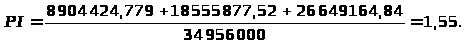 Т.е. на один рубль инвестиций приходится 1,55 руб. чистого дохода, рентабельность составляет 55%, что говорит о прибыльности и привлекательности данного проекта.