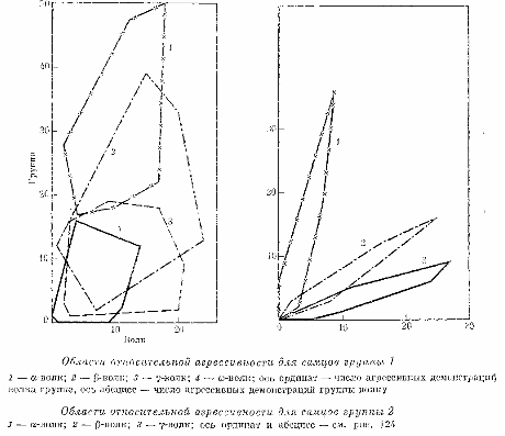 Для графического изображения этих отличий нами предложена следующая схема. Для каждого животного построен график зависимости числа агрессивных действий, адресованных им группе от числа агрессивных действий остальных членов группы, адресованных ему. Такое соотношение, разумеется, будет подвержено некоторым колебаниям в ходе опытов п, в конечном итоге, мы получим некие области, характеризующие место животного в группе. В том случае, если структура группы определяется иерархией, основанной почти исключительно на агрессии, можно ожидать, что центры областей, характеризующих агрессивность отдельных животных, будут располагаться по некоторой гипотетической гиперболе: а - волк максимально приближен к оси ординат п удален от оси абсцисс, со - волк - к оси абсцисс, а остальные располагаются между ними. Если же структура группы основана на гибком разделении поведенческих ролей и отношениях лояльности между отдельными животными, то можно ожидать иного распределения областей относительной агрессивности. Например, низкоранговые животные будут вообще отличаться незначительным участием в агрессивных столкновениях. Возможно и выделение одного или нескольких контролирующих животных, обеспечивающих соблюдение порядка кормления в группе, что выразится з растянутости соответствующей области вдоль осп ординат.