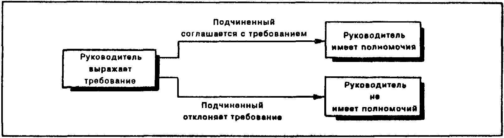 Однако, как заметил Честер Барнард (представитель «административной» школы и бывший президент фирмы «Нью-Джерси Белл»), подчиненный имеет право отклонить требования начальника. На основе этого Барнард сформулировал концепцию принятия полномочий. Он определил полномочия как «информацию (приказание), на основе которой участник организации направляет свои действия и определяет, что он обязан или не должен делать в рамках задач организации». Таким образом, по мнению Барнарда, если подчиненный не принимает полномочий от руководителя, то передачи полномочий не происходит (см. рис. 2.2).
