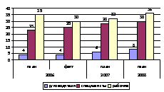 На основании данных расчета затрат по обучению персонала по менеджменту качества За период 2003-2005 гг. общее количество численности сотрудников видно, что снижается, в целом численность обучающихся снизилась на 70 чел. по отношению к уровню 2003 г. Среди категорий персонала, численность работников обучающихся среди специалистов и руководителей снизилась по сравнению с 2003 г. на 24 человека, а среди рабочих на 46 чел.