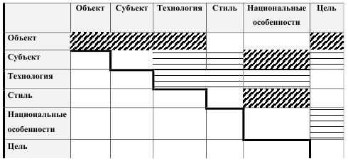 На рис. 3 диагональной штриховкой отмечена выявленная в процессе исследования содержания видов менеджмента взаимосвязь следующих пар критериев классификации видов менеджмента: объект управления – объект управления, объект управления – субъект управления, объект управления – технология управления, объект управления – цель управления, субъект управления – национально-культурные особенности управления, стиль управления – национально-культурные особенности управления.
