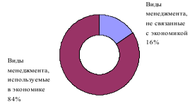 На рис. 1 представлено процентное соотношение видов менеджмента, не связанных с экономикой, и видов менеджмента, используемых в экономике. Абсолютное большинство видов менеджмента (84%) используется в экономике. Очевидно, что с течением времени удельный вес последних будет возрастать, так как в экономику вовлекается все большее количество сфер знания (например, сейчас никого не удивляет, что в деятельности как коммерческих, так и не коммерческих предприятий используется знание психологии и социологии, которые стали практическими инструментами менеджмента).