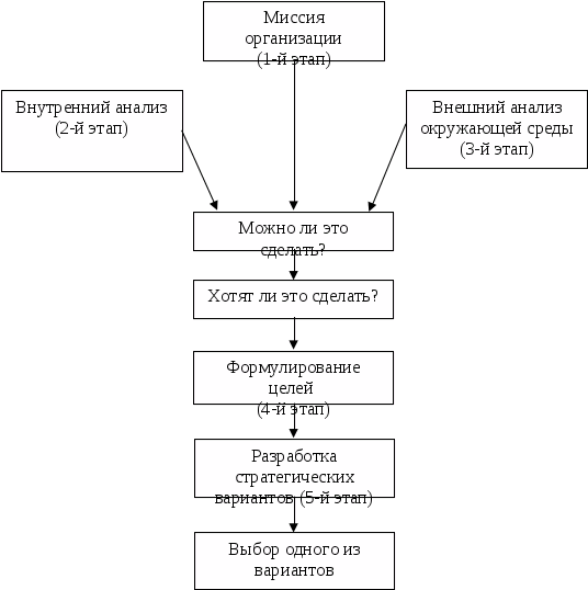 Ответы на эти вопросы дают стратегический анализ, стратегический выбор (или собственно стратегическое планирование) и реализация стратегии (принятого стратегического решения) [29. С.32].