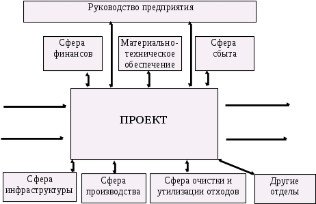 Проект можно рассматривать как кратковременную мини - организацию внутри предприятия. На проект оказывают влияние все подразделения предприятия, с которыми связан процесс его появления и реализации. Как правило, это подразделения из следующих сфер деятельности:
