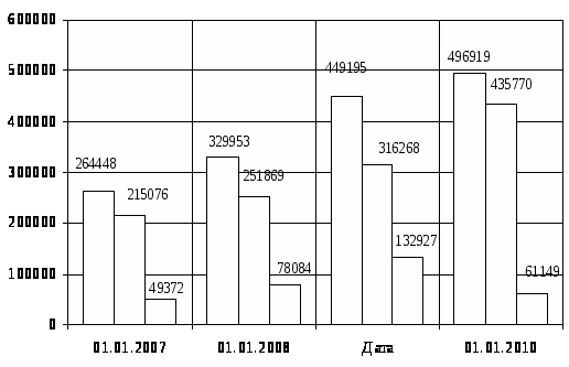 Анализ данных приведенных на диаграмме показывает, что величина чистых активов существенно увеличилась с 305450 тыс. р. в 2007 г. до 515657 тыс. р. в 2009 г. Это можно объяснить ростом величины активов в расчетах 450525 тыс. р. на дату 01.01.2008 г. до 737837 тыс. р. на дату 01.01.2009 г.