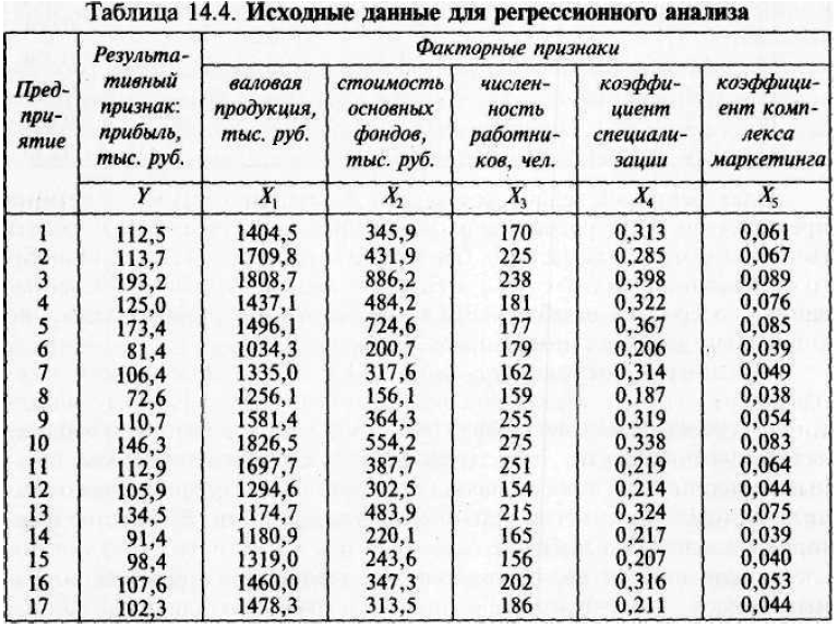 Далее рассчитывается комплексная оценка уровня маркетинга предприятия — коэффициент маркетинга, который вносится в таблице 1. Кроме того, в названую таблицу включены показатели, характеризующие предприятие в целом. Данные в таблице будут использованы для проведения регрессионного анализа. Результативным признаком является прибыль. В качестве факторных признаков наряду с коэффициентом маркетинга использованы следующие показатели: объем валовой продукции, стоимость основных фондов, численность работников, коэффициент специализации.