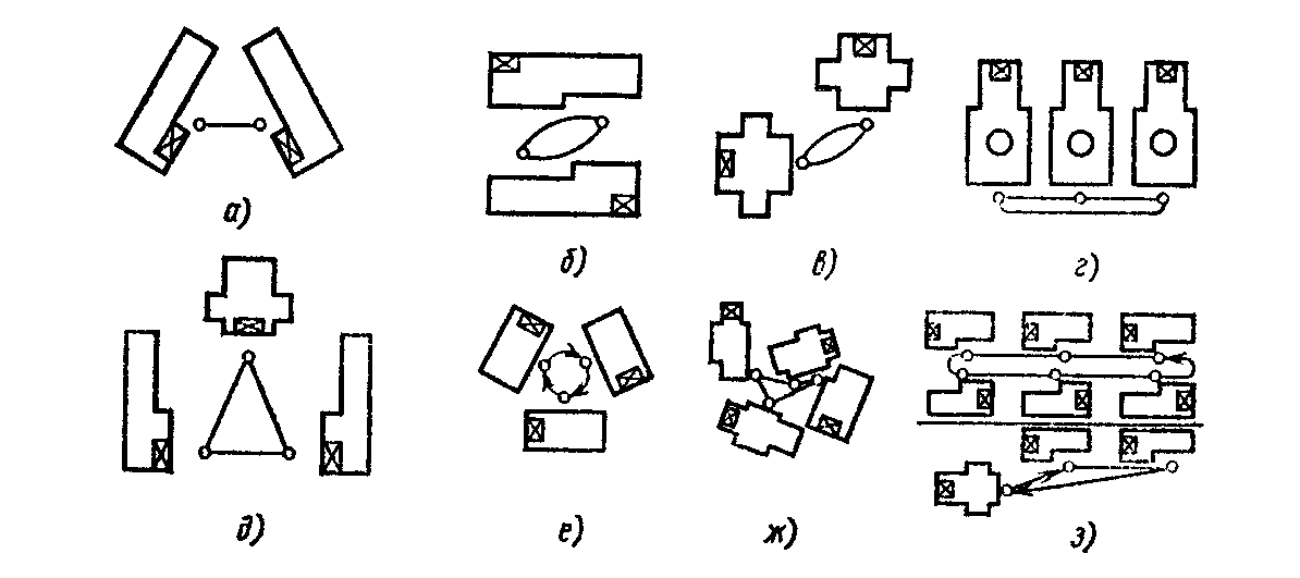 Рис. 3. Варианты расстановки оборудования и маршрутов рабочих при многостаночном обслуживании: а – угловое; б – параллельное; в – перпендикулярное; г – линейное; д – П-образное; е – кольцевое; ж – асимметричное; з – смешанное