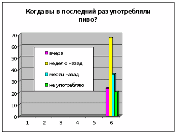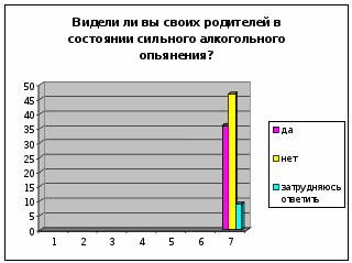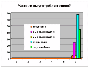 Вывод: Алкоголизм очень быстро «молодеет», т.к. подростки начинают употреблять пиво уже в средней, а некоторые даже в начальной школе. Основными причинами его употребления являются подражание старшим (старшеклассникам или своим родителям). Печальный факт – примерно 1/3 опрошенных учеников видели своих родителей в состоянии сильного алкогольного опьянения. Также не все учащиеся знакомы с серьезными последствиями употребления пива, а, следовательно, употребляют его, не задумываясь.
