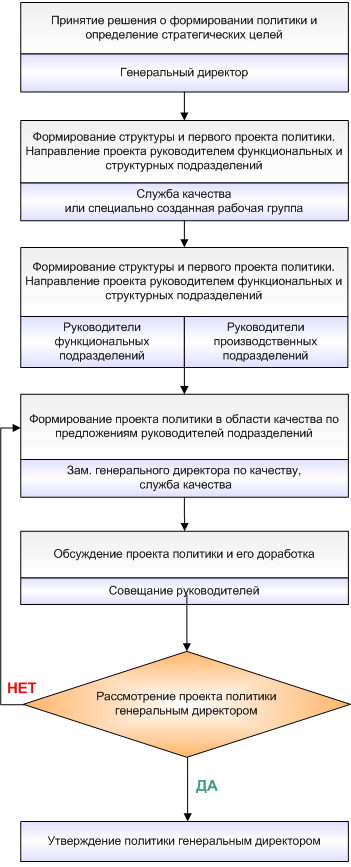 Руководители высшего звена предприятия лично должны участвовать в решении проблем качества, и кроме этого принимать на себя определенные обязательства в области обеспечения качества. Это довольно новое положение для российских руководителей, т. к. вплоть до 80-х годов функции административного руководства качеством делегировались на более низкие уровни управленческой иерархии. Высшее руководство предприятия должно принять решение о внедрении стандартов ИСО с учетом возрастающих потребностей рынка и инициировать работы в этом направлении.