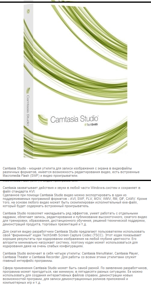 CamtasiaStudio решение для подготовки видеопрезентаций и интерактивных демонстраций работы с компьютерными программами, позволяющее создавать видеоматериалы профессионального качества и публиковать их в наиболее распространенных форматах.