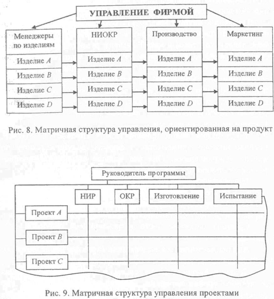 Такая схема давно применялась в управлении НИОКР, а сейчас широко применяется в фирмах, ведущих работу по многим направлениям. Она все больше вытесняет линейно-функциональную.