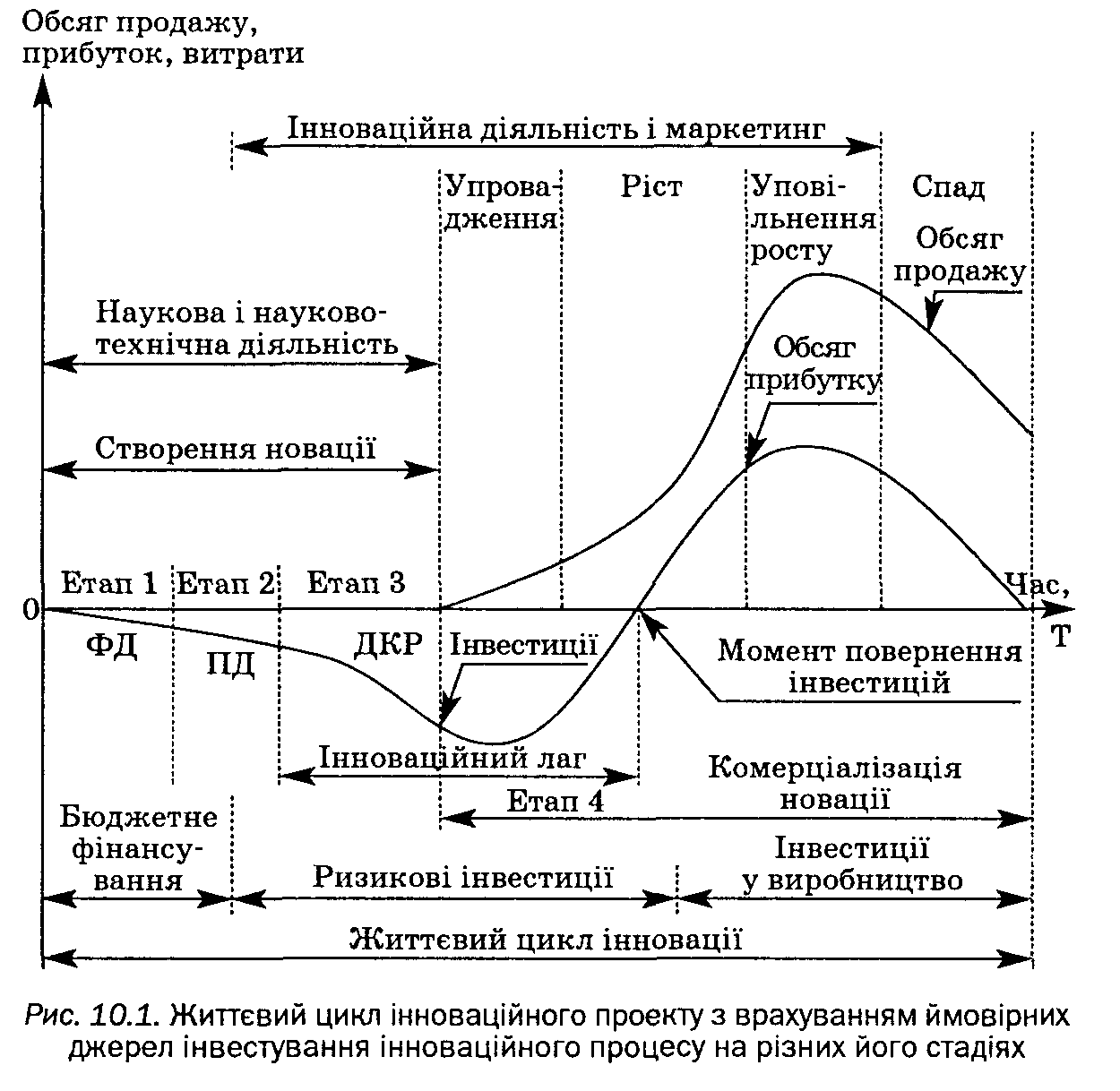 При прийнятті рішення щодо реалізації інноваційного проекту слід враховувати вартість капіталу, залученого з різних джерел на різних стадіях життєвого циклу інноваційного проекту, і очікуваний прибуток від реалізації інноваційної продукції. Схему життєвого циклу інноваційного проекту з урахуванням ймовірних джерел інвестування інноваційного процесу на різних його стадіях зображено на рис. 1