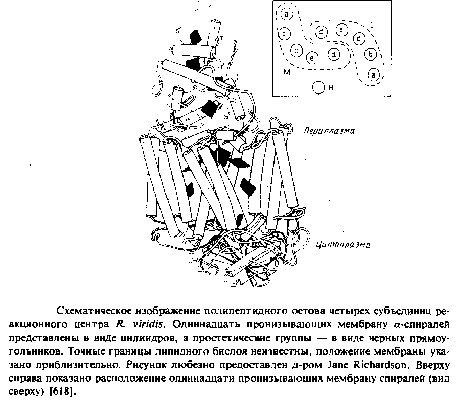 Суммарная мол. масса реакционного центра из R. viridis составляет примерно 150 ООО, а кажущаяся мол. масса субъединиц - 38 ООО, 35 ООО, 28 ООО и 24 ООО. Заметим, что электрофорез в ПААГ-ДСН дает неправильные молекулярные массы для Н, М и L субъединиц; об этом свидетельствуют данные о числе аминокислотных остатков в каждом полипептиде, полученные при секвенировании ДНК. Очищенный комплекс был закристаллизован с использованием сульфата аммония как осаждающего агента в присутствии детергента N. N-диме-тилдодециламин-М-оксида и органического амфифильного соединения гептан-1,2,3-триола. Кристаллы были в достаточной степени упорядочены и фотохимически активны. Структура этого четырехсубъединичного белка была установлена с разрешением около 3 А. Детергент в кристаллах не упорядочен, поэтому невозможно точно определить положения границ погруженных в мембрану участков. Размеры комплекса - 30 х 70 х 130 A. L - и М-субъединицы содержат по пять трансмембранных а-спиральных участков, а у Н-субъединицы такой участок только один.