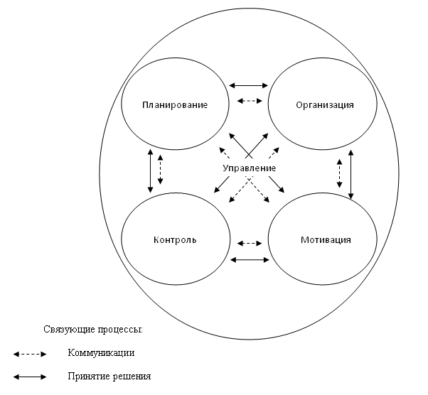 Функции управления – обособленные направления управленческой деятельности. Таким образом, процесс управления – взаимосвязь функций планирования, организации, мотивации и контроля, которые объединены связующими процессами коммуникации и принятия решения.