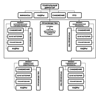 После преобразования структуры предприятие состоит из центрального предприятия (г. Мурманск, участки Кольского района, участки Ловозерского района) и филиалов (филиал Заполярненская горэлектросеть, Ковдорская электросеть, Кадалакшская теплосеть, Гаджиевская теплосеть)(Рис. 7).