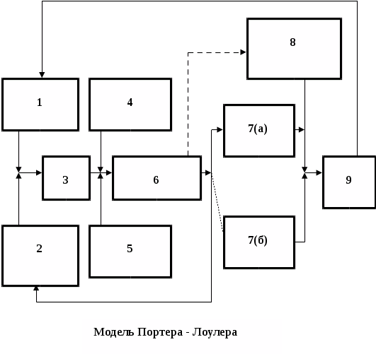 Л. Портер и Э. Лоулер разработали комплексную процессную теорию мотивации. Она соединяет концепции Маслоу, Герцберга, МакКлелланда с идеями процессного подхода В. Врума и устанавливает связь между вознаграждением и результатами. В модели фигурирует пять переменных: затраченные усилия, восприятие, полученные результаты, вознаграждение, степень удовлетворения. Согласно модели Портера - Лоулера, достигнутые результаты зависят от приложенных сотрудником усилий, его способностей и характерных особенностей, а также осознания им своей роли. Уровень приложенных усилий будет определяться ценностью вознаграждения и степенью уверенности в том, что данный уровень усилий действительно повлечет за собой вполне определенный уровень вознаграждения. Более того, в теории Портера - Лоулера устанавливается соотношение между вознаграждением и результатами, т.е. человек удовлетворяет свои потребности посредством вознаграждений за достигнутые результаты (см. приложение 2). Согласно модели Портера -Лоулера результаты, достигнутые сотрудником, зависят от трех переменных: затраченных усилий (3), способностей и характерных особенностей человека (4), а также от осознания им своей роли в процессе труда (5). Уровень затрачиваемых усилий в свою очередь зависит от ценности вознаграждения (1) и того, насколько человек верит в существование прочной связи между затратами усилий и возможным вознаграждением (2). Достижение требуемого уровня результативности (6) может повлечь внутренние вознаграждения (7а), такие, как чувство удовлетворения от выполненной работы, чувство компетентности и самоуважения, а также внешние вознаграждения (76), такие, как похвала руководителя, премия, продвижение по службе. Пунктирная линия между результативностью и внешним вознаграждением означает, что может существовать связь между результативностью какого-либо сотрудника и выдаваемыми ему вознаграждениями. Дело в том, что эта вознаграждения отражают возможности вознаграждения, определяемые руководителем для данного сотрудника и организации в целом. Пунктирная линия между результативностью и вознаграждением, воспринимаемым как справедливое (8), использована для того, чтобы показать, что в соответствии с теорией справедливости, люди имеют собственную оценку степени справедливости вознаграждения, выдаваемого за те или иные результаты. Удовлетворение (9) — это результат внешних и внутренних вознаграждений с учетом их справедливости (8). Удовлетворение является мерилом того, насколько ценно вознаграждение на самом деле (1). Эта оценка будет влиять на восприятие человеком будущих ситуаций.